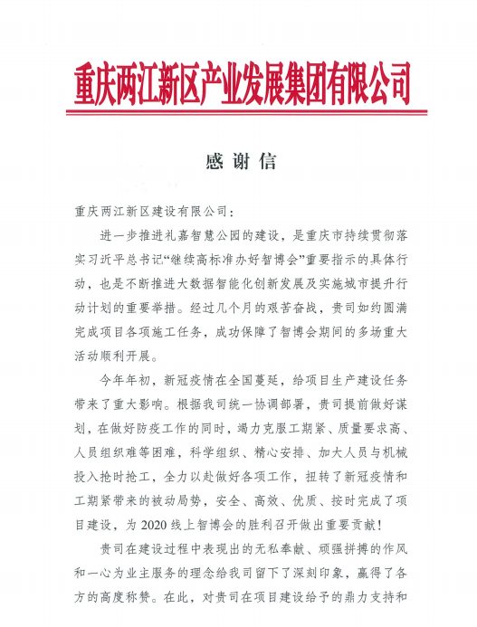 來(lái)源:辦公室 王凡 發(fā)布日期:2020/12/15 【打印此文】近日,重慶兩江新區(qū)建設(shè)有限公司再次收到重慶兩江新區(qū)產(chǎn)業(yè)發(fā)展集團(tuán)有限公司發(fā)來(lái)的感謝信,就兩江建設(shè)公司高效、安全、優(yōu)質(zhì)、按時(shí)完成禮嘉智慧公園的建設(shè)任務(wù)表達(dá)了誠(chéng)摯謝意。