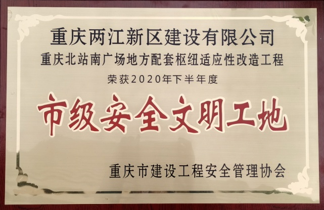由兩江建設公司施工建設的重慶北站南廣場地方配套樞紐適應性改造工程自開工以來現場安全管理高起點、高標準,嚴格規范化、標準化管理。經過公司和項目部的共同努力,項目榮獲2020年下半年度重慶市建筑安全文明工地獎。