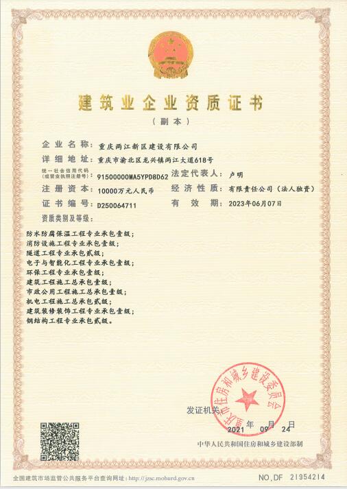 兩江建設(shè)公司又新增4個壹級和1個貳級工程專業(yè)承包資質(zhì)