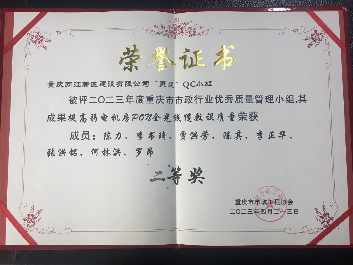 近日,公司承建的重慶高等工程師學院改造裝修工程“聚星”QC小組其成果“提高弱電機房PON全光線纜敷設質量”榮獲了2023年度重慶市市政行業優秀質量管理小組二等獎。此項全市市政行業優秀質量管理獎是在國家大力支持企業提高自主創新能力,加快推進技術創新工作政策大背景下取得的。公司也不斷地通過科技創新管理手段來促進項目部施工現場工程質量管理工作的深入發展,相互學習交流,并通過發揮科學技術的支撐作用,來促進本企業的高質量發展。
