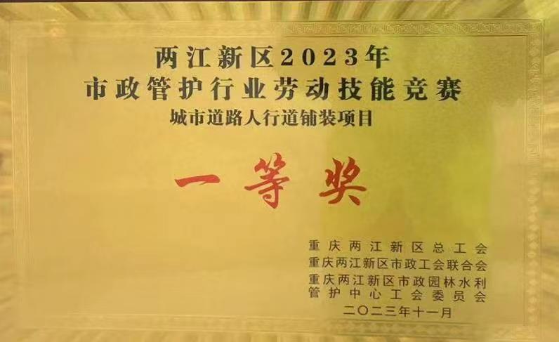 11月16日,兩江建設公司派出的參賽隊伍榮獲了兩江新區2023年市政管護行業勞動技能競賽城市道路人行道鋪裝版塊一等獎。